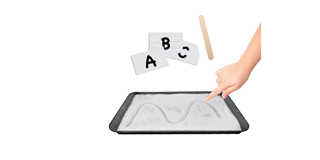 - In advance, fill a baking tray with salt or white sand. (You can use any kind of long, shallow tray or box.) On index cards, draw a variety of lines—straight lines, wavy lines, loopy lines, zigzags—and letters.
